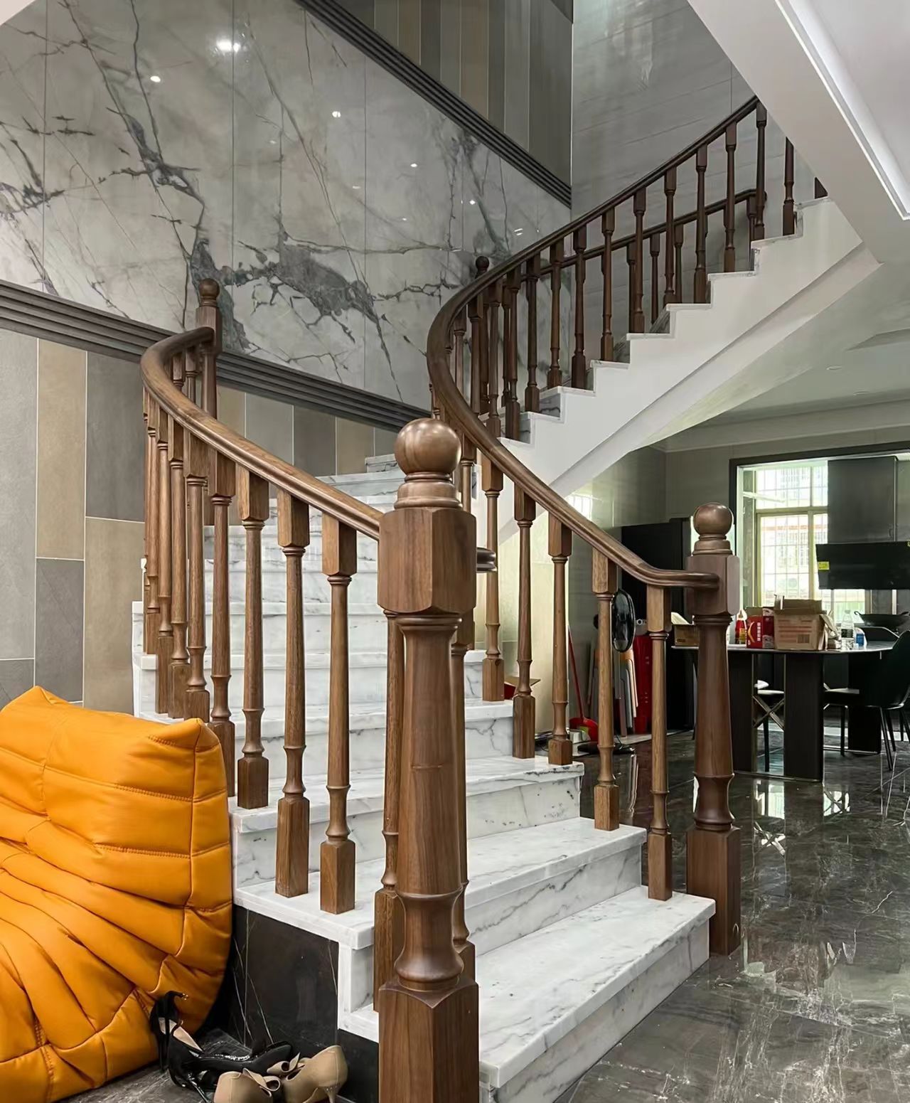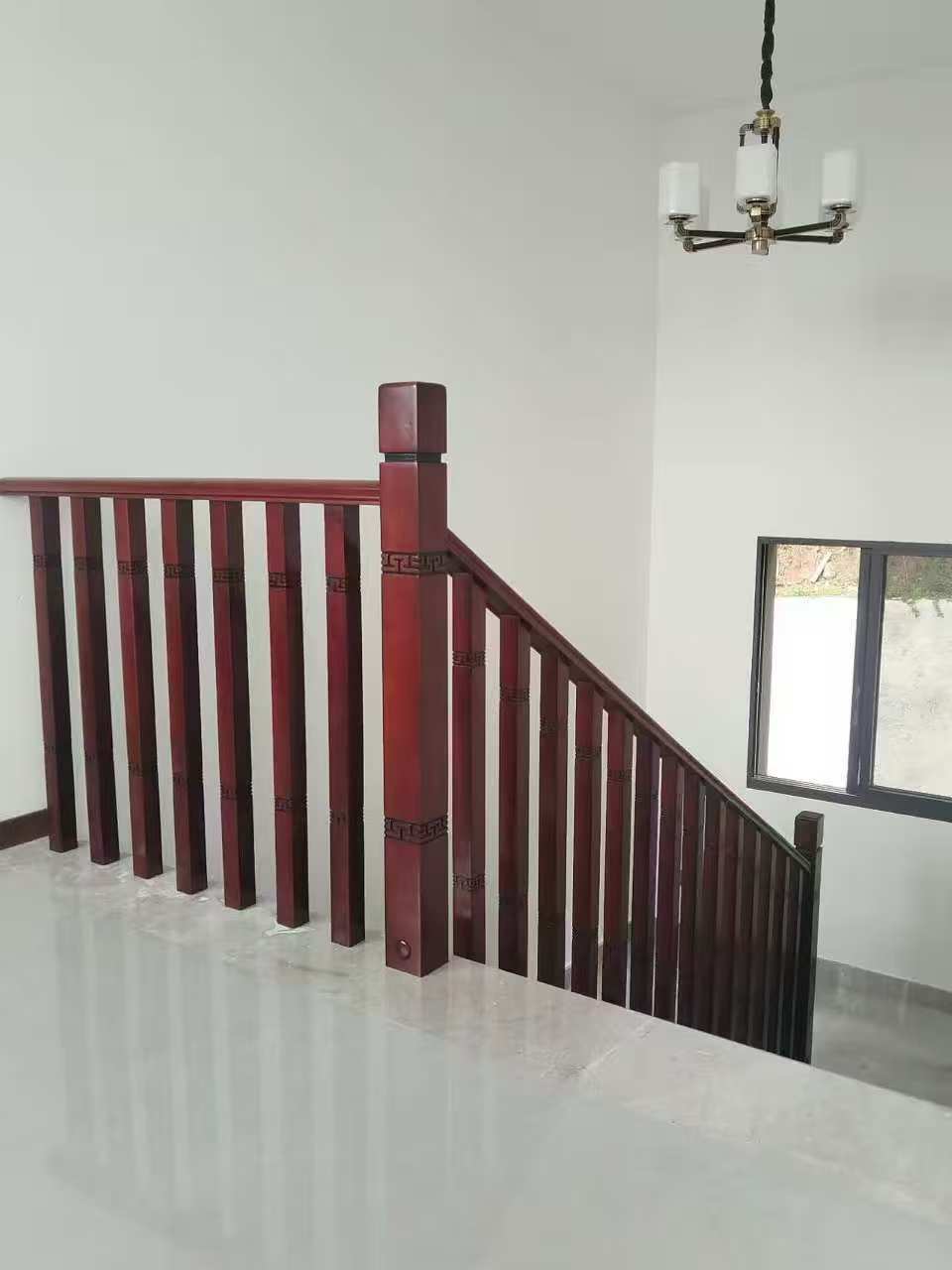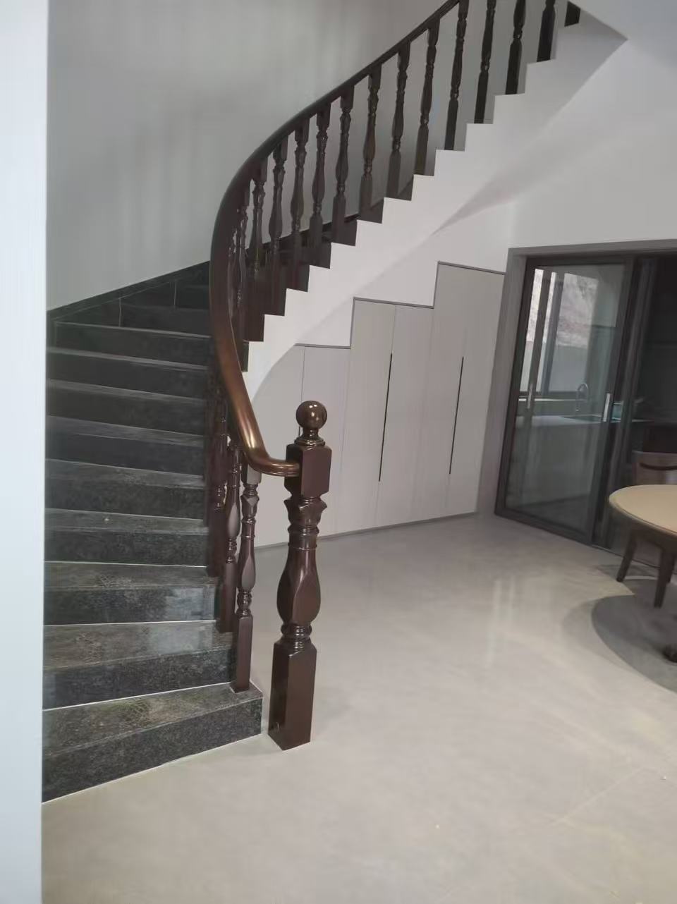 图为专业安装后的实木踏步细节,展示了踏步与栏杆、墙面结构的完美收口与工艺水平。